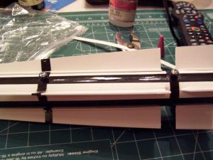The final step was to install the rail guides. They instructions for this said to cut an "X" in each of the desired locations with a razor knife and then put a drop of think CA on the spot. The guides were then screwed into position.