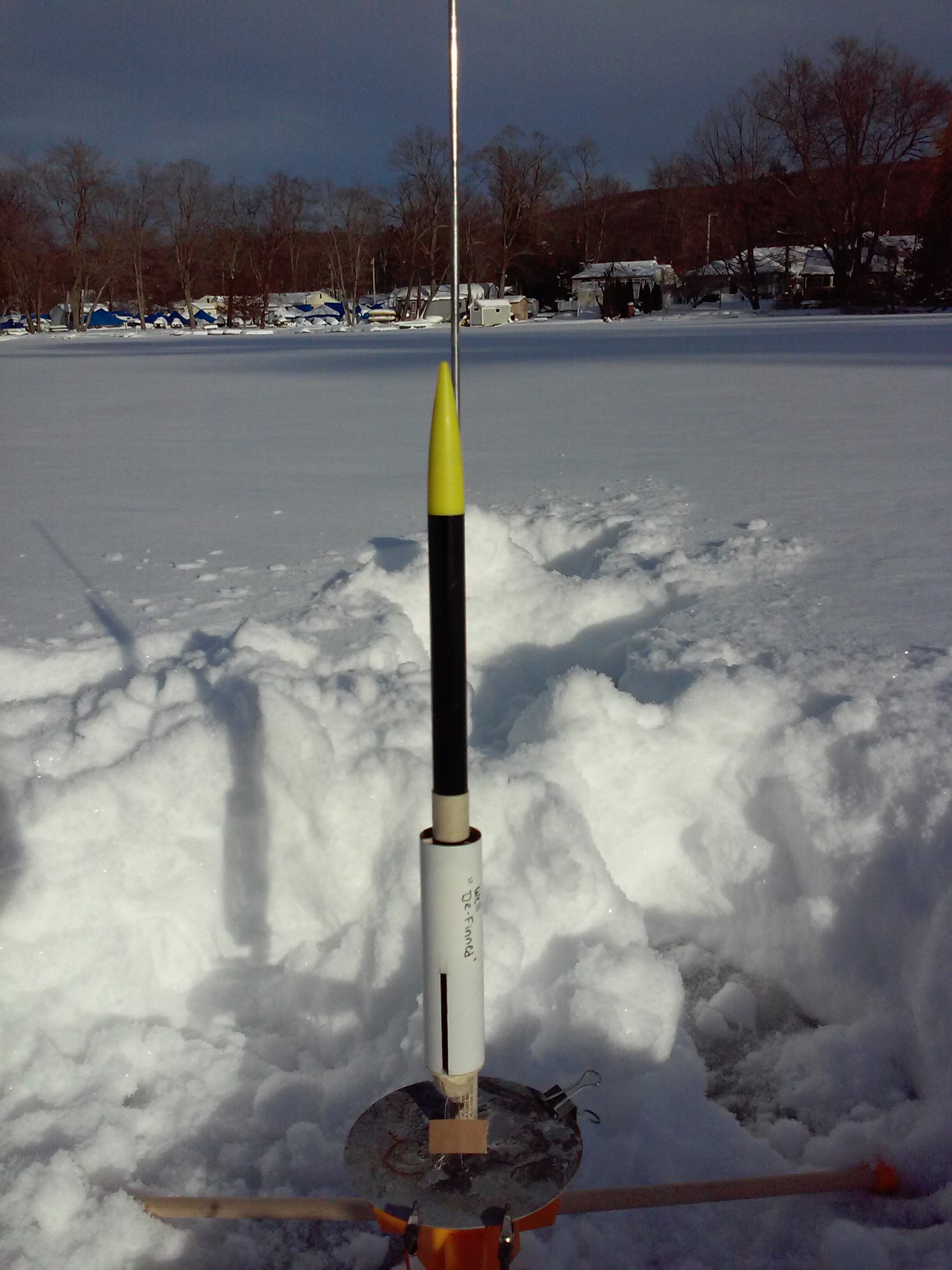 "Finless Rocket #2" - Second prototype design for RAIS (Ram Air Induction Stabilization) testing. Uses an outer compartmentalized shroud and air outlets to try to simulate "air fins" for rear stabilization. BT5 body tube and has streamer recovery.