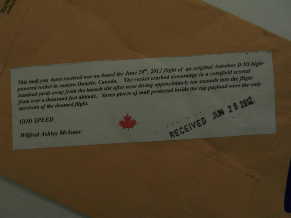 The Astrobee D III rocket crashed ten seconds after lift-off in a cornfield several hundered yards away from the launch pad just outside of Gananoque Ontario, Canada on the morning of June 29th, 2012. On-board the Canadian mail rocket were seven postal letters with Gerhard Zucker 'First Canadian Rocket-Flight' stamps attached. The letters managed to survive after the rocket nose dived from an altitude above 1000 feet. Both on-board camers including a Go pro were destroyed as well as the rocket itself. The crash as well as poor launch site conditions will postpone the final flight of the Canadian rocket mail program until late October or early November 2012.