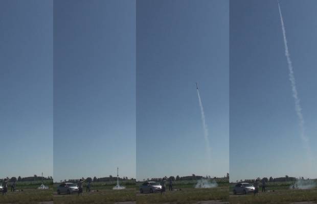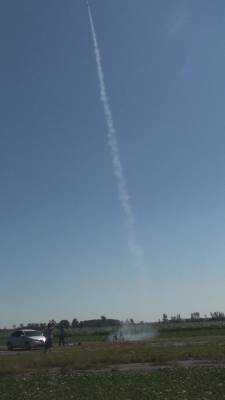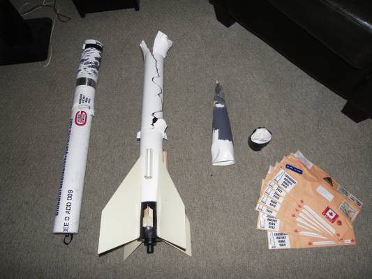 The ASTROBEE D III rocket is a modified version of Aerotech's Astrobee D that included 3 strap-on boosters as well as an electronics compartment in the aft section of the main booster. The unique strap-on booster system allows the little booster rockets to drop away from the main vehicle during the flight had everything worked properly. Unfortunately the three strap-on boosters failed to ignite during the lift-off and two of them were later recovered at the crash site several hundred yards away. The ASTROBEE D III mail rocket was retired after only one flight however the overall configuration of the 1 1/2 stage rocket is considered a success.
