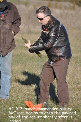 Wilfred Ashley McIsaac returned to the launch pad in November 2010 with his modified Arreaux high powered rocket now named the A2-R13. He organized a unique ceremony in Picton, Ontario on Remembrance Day (2010) which honoured the men and women of the Canadian Armed Forces, both past and present, as well as paying tribute to the employees of the famous Avro Arrow program from the 1950’s. Following a short speech at a retired CFB military base and airfield, McIsaac launched his A2-R13 rocket carrying twelve poppies wrapped in a miniature Canadian flag and a uncooked grocery store egg. The contents were protected inside the rocket's payload bay located near the center of the launch vehicle. A small crowd watched as the rocket reached over 3000 feet in altitude before returning safely to the ground under a parachute. This may be the only November 11th commemoration in Canada’s history that included a rocket launch for this special occasion.