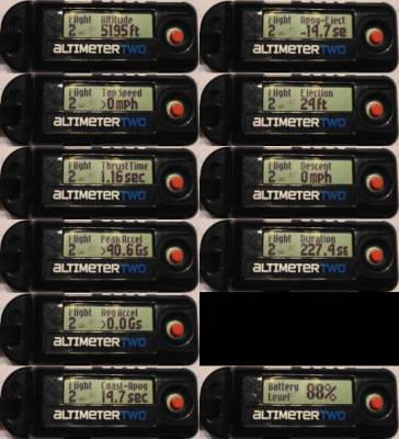 Flew with AltimeterTwo, reported 5195' apogee, >0 mph max (max G exceeded), 16s to apogee, 227.4s total flight duration.
