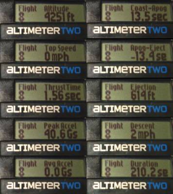 Flew with AltimeterTwo, data recorded. Known issue with AltimeterTwo resulted in bad readings for Apogee-Eject, Eject altitude and Descent speed. Also reported bad readings for Top Speed (0 mph), Peak Acceleration (40.6 G) and Average Acceleration (0.0 G).