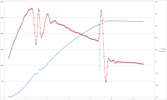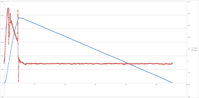 Flew with StratoLogger SL100. 2402' apogee, 445 ft/s max velocity, ~10s to apogee, 110.3s total flight duration.