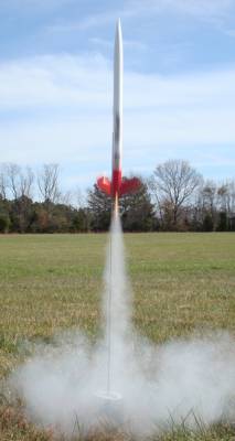 Very well behaved off a longer (48 inch) rod. Nice smooth straight boost. Stalled out, tipping over at ejection. Good chute, minimal drift, grass landing, no damage.