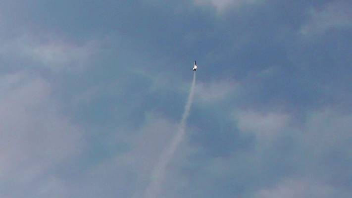 I ignited the C6 which burned for about 2 seconds. It accelerated at a peak of 5.2 Gs, and averaged 1.8 for the burn. During this time the model slowly rolled and wavered in the gusty winds aloft as told by the wavy smoke trail, but it remained going up during the boost phase. This pushed the model to 87 mph as expected and then coasted for 3.1 seconds to an altitude of 336 feet, less than expected.