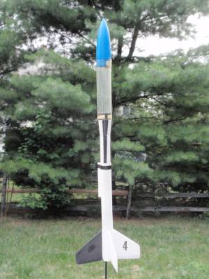 The X-Ray: Nice little payload rocket, using a tape-friction-fit motor mount. Not at all like the modern Estes X-Ray kit. This has a balsa nosecone, transition and fins. It is a very light model. This ol' girl sure made a lot of flights and she's showing her age. In the early days this was my tallest and most impressive rocket for the first year or two, so I would really like to get her flying again and see how high it can go, I imagine close to 1000 feet. To restore this model, I need to find a clear BT-50 payload tube since the old one is cracked. I don't recall it cracking during a flight, it most likely occurred while in storage.