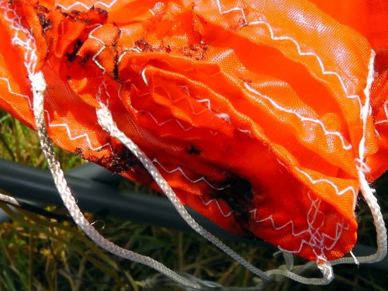 The Nylon 'chute was effectively glued shut from gasses escaping through the square corners of the wadding & dog barf. Fortunately, this rocket was outfitted with an emergency 9" parachute that saved it.